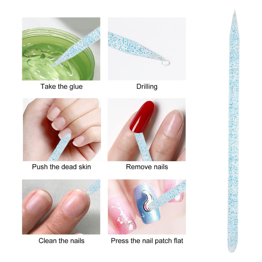 - 2 en 1 multifuncional — La barra de limpieza de uñas se puede usar para limpiar la pared lateral o la uña debajo de la uña, empujar hacia atrás y exfoliar la cutícula. También se puede usar para mojar pegamento, recoger y ajustar accesorios de uñas, hacer pequeñas líneas y patrones en las uñas o aplanar calcomanías de uñas.