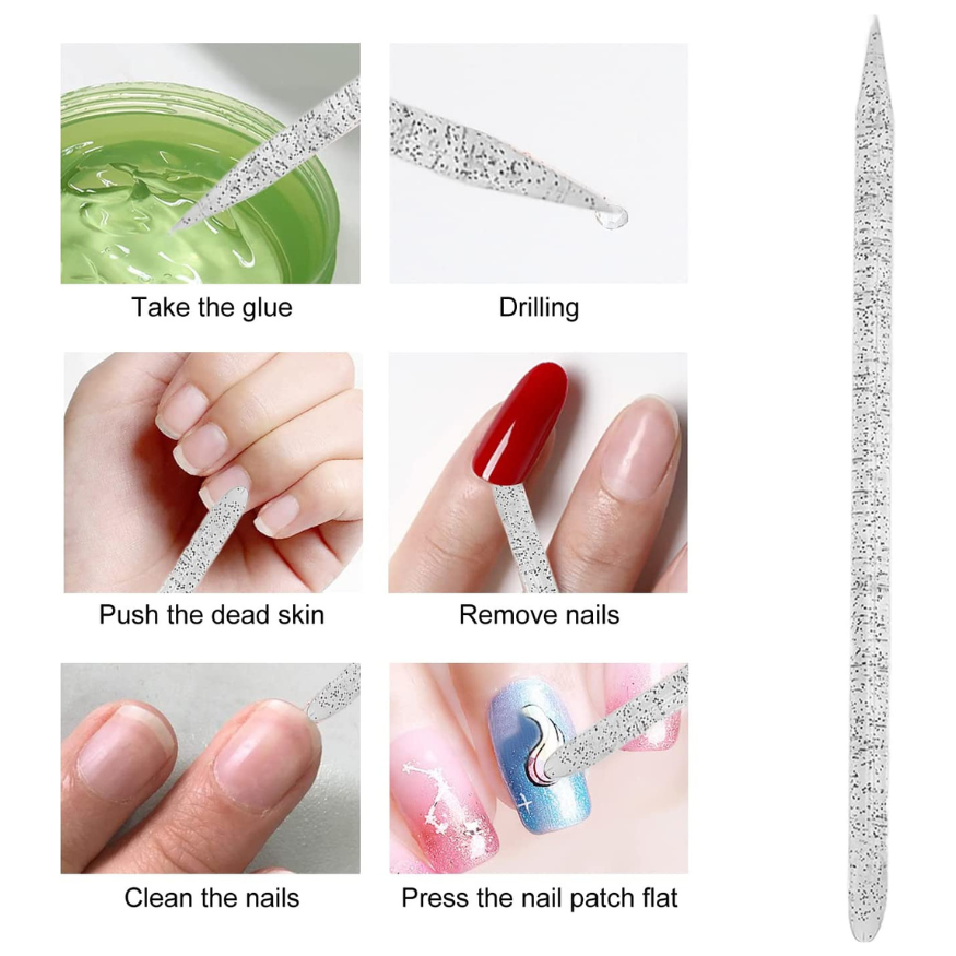 - 2 en 1 multifuncional — La barra de limpieza de uñas se puede usar para limpiar la pared lateral o la uña debajo de la uña, empujar hacia atrás y exfoliar la cutícula. También se puede usar para mojar pegamento, recoger y ajustar accesorios de uñas, hacer pequeñas líneas y patrones en las uñas o aplanar calcomanías de uñas.