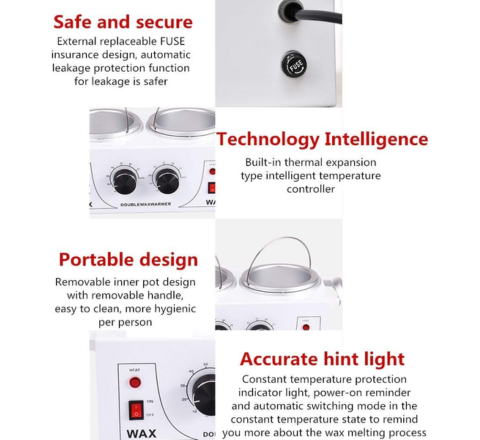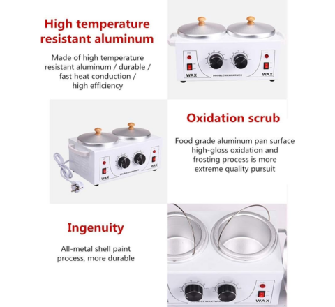 - Material de aluminio de alta calidad: nuestro calentador eléctrico de doble cera está hecho de cuerpo de construcción de metal de acero inoxidable y maceta de aluminio. Consejos de limpieza sencillas: calentar durante 5 a 10 segundos para secar la cera enfriada y luego usar un trapo o un palo de cera para limpiar el resto de la cera.